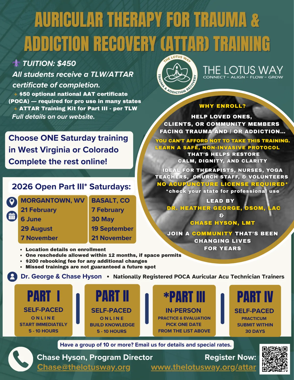 Auricular Therapy for Trauma and Addiction Recovery (ATTAR) is a nationally recognized practice and practitioner training program offered through The Lotus Way, a 501(c)(3) nonprofit organization.